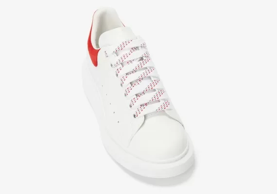 The Alexander McQueen Oversized Sneaker "Lust Red" is a perfect blend of luxury and bold design, making it an essential piece for any fashion-forward collection. Presented in white smooth calfskin leather, this lace-up sneaker features a rounded toe and is trimmed with lust red suede heel detail. It includes large flat laces and the Alexander McQueen signature on both the tongue and heel counter. The oversized rubber sole adds both style and comfort, making it a standout addition to any collection.
