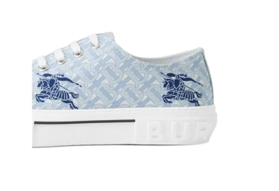 Experience a blend of sophistication and casual style with Burberry's Equestrian Knight Low-Top Sneakers, designed for comfort and a distinguished look. These sneakers feature a captivating light blue, navy blue, and white palette. Crafted from a premium cotton blend, they ensure comfort and a refined appearance. The signature Equestrian Knight motif is prominently displayed, accompanied by a subtle monogram print. The logo at the sole highlights the brand's attention to detail, while the contrasting toecap adds a contemporary touch. Designed with a round toe and front lace-up fastening, these sneakers offer a secure fit. The branded insole guarantees both style and comfort, reflecting Burberry's commitment to quality craftsmanship. The flat rubber sole combines fashion with practicality, making these sneakers a stylish choice for any occasion.