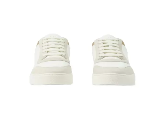 Experience the epitome of style with Burberry's Vintage Check Panelled Sneakers. In a pristine white hue, these sneakers are meticulously crafted from supple calf leather, offering both sophistication and durability. The iconic Vintage Check pattern takes center stage, complemented by suede trim and intricate perforated... Read more Experience the epitome of style with Burberry's Vintage Check Panelled Sneakers. In a pristine white hue, these sneakers are meticulously crafted from supple calf leather, offering both sophistication and durability. The iconic Vintage Check pattern takes center stage, complemented by suede trim and intricate perforated detailing, creating a harmonious blend of heritage and contemporary design. The logo-embossed tongue adds a distinctive touch, while the panelled design and round toe contribute to the overall aesthetic appeal. Ensure a personalized fit with the front lace-up fastening, and enjoy the comfort and luxury of the branded insole. The rubber outsole not only provides traction but also underscores the sneakers' commitment to practicality without compromising on style. Step into a world of timeless elegance and modern flair with these Burberry Vintage Check Panelled Sneakers, a testament to the brand's enduring legacy in the realm of fashion. Read less