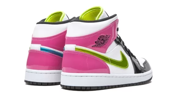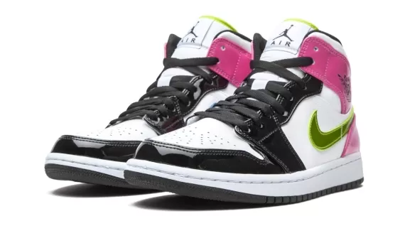 The Women’s Air Jordan 1 Mid SE “Cyber/Active Fuchsia” is a vivacious colorway of Michael Jordan’s first signature shoe in its mid-top silhouette. Fitted in women’s sizing, the “Cyber/Active Fuchsia” Jordan 1 Mid evokes summer’s casual and carefree vibes thanks to its eccentric design that combines materials, textures, and color... Read more The Women’s Air Jordan 1 Mid SE “Cyber/Active Fuchsia” is a vivacious colorway of Michael Jordan’s first signature shoe in its mid-top silhouette. Fitted in women’s sizing, the “Cyber/Active Fuchsia” Jordan 1 Mid evokes summer’s casual and carefree vibes thanks to its eccentric design that combines materials, textures, and colors in a unique new way. Glossy black patent leather overlays appear on the forefoot, toe cap, and eyelets. The same premium patent leather detailing is used again on the Active Fuchsia collar and heel overlays. A variety of smooth white leather forms the base of the upper. Elsewhere, a dark neon green patent leather Swoosh logo can be found on each lateral side while blue Swooshes are present on the medial sides. A black leather “Wings” emblem is located on the collar. Other details include a white nylon tongue with green accenting on the top, a black Jumpman on the tonal nylon tongue tag, and a black liner. The white rubber outsole and black outsole finish off the look of this casual lifestyle look for the Women’s Air Jordan 1 Mid. Read less