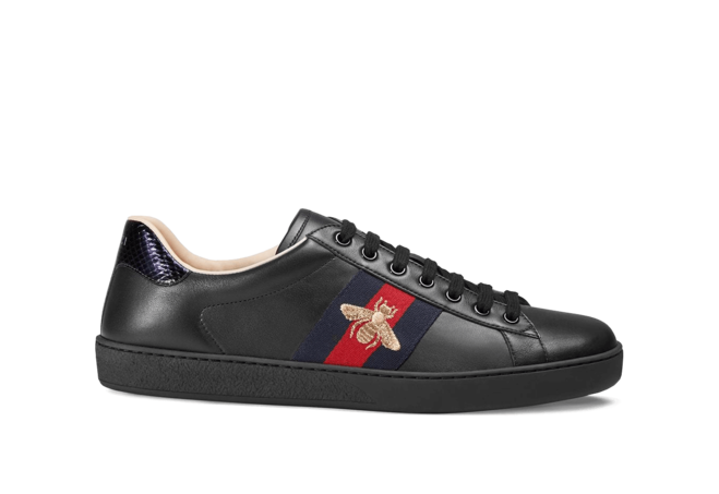 Gucci's Ace Low Top Sneaker in black leather combines timeless elegance with luxurious detailing, making them a standout addition to any wardrobe. These low-top sneakers feature a sleek black leather upper adorned with the House's gold embroidered bee, set against the iconic blue and red Web stripe. The bee, an archival code first introduced in Gucci ready-to-wear in the 1970s, adds a touch of sophistication. The sneakers also include red leather detail on the heel of one shoe and blue on the other. The durable rubber sole ensures both comfort and longevity, making them perfect for adding a touch of luxury to any casual outfit. Read less