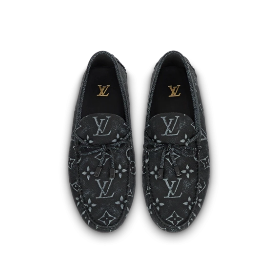 This edition of the LV Driver moccasin comes in Monogram grained calf leather with a faded effect coordinating with the leather goods collection. The first driving shoe created by Virgil Abloh, this model has a hand-stitched vamp and a tubular construction for lightness and flexibility. The outsole features a Monogram pattern inspired by French formal gardens. Read less