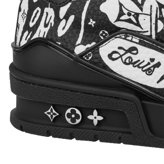 This version of the LV Trainer sneaker comes in canvas printed with Louis Vuitton comic motifs inspired by the Spring-Summer 2023 men\'s show. Designed by Virgil Abloh, this cult model references vintage basketball sneakers. It is signed with the LV Initials, Monogram Flowers and the #54 logo, referring to 1854, the date the House was founded. Read less