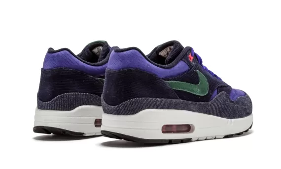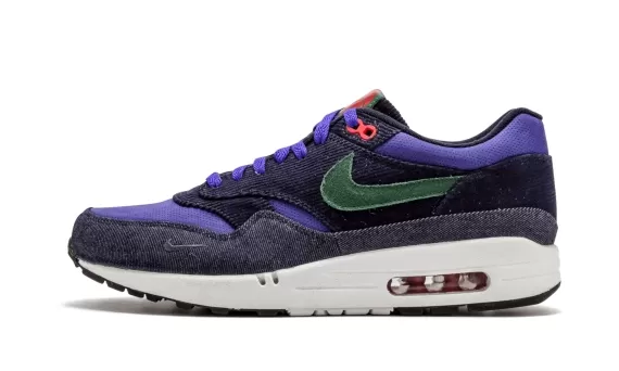 A holy grail for many Air Max 1 collectors, this is the legendary colorway in collaboration with Patta from 2009. The iconic silhouette is crafted with dark blue corduroy and denim with purple perforated suede, all finished with green and red accents.