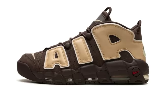 The Nike Air More Uptempo "Baroque Brown" presents an earthy-toned iteration of Scottie Pippen’s iconic signature sneaker. Originating in 1996, this silhouette gained prominence when Pippen sported it during the Chicago Bulls' historic 72-win season in 1995-96. The "Baroque Brown" rendition boasts a distinctive aesthetic, featuring a brown suede upper adorned with oversized, graffiti-inspired “AIR” branding in Sesame hues on each side. Adding contrast, a white Swoosh adorns the toe, while a Sesame jeweled Swoosh embellishes the heel. Completing the design, visible Air units in both the forefoot and heel of the brown midsole enhance both style and performance. Read less