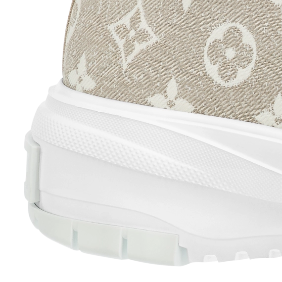 This summery version of the LV Squad sneaker boot comes in bleached Monogram denim, which is complemented by tonal leather trim. This fashionable hi-top is distinguished by its double laces and chunky yet lightweight rubber outsole. It is signed with a rubber LV Circle logo on the tongue.