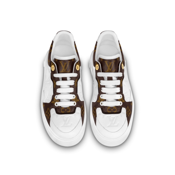 The Time Out sneaker is reinterpreted in a combination of soft calf leather and patent Monogram canvas for a refined look. This emblematic style is notable for its elevated, treaded rubber outsole, which is decorated with Monogram Flowers. Another key detail are the two large, gold-tone eyelets, engraved with the Louis Vuitton signature.