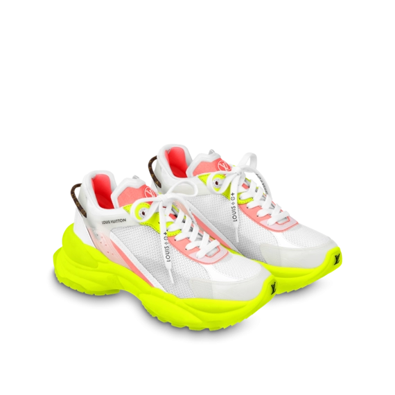 The Run 55 sneaker is a racewear-inspired design, which is characterized by elaborate layers of technical materials, including mesh and rubber, combined with leather. This version further intensifies the sporty aesthetic with a fluorescent rubber outsole, which is lifted for optimum bounce. This model features multiple Louis Vuitton signatures on both the upper and outsole.
