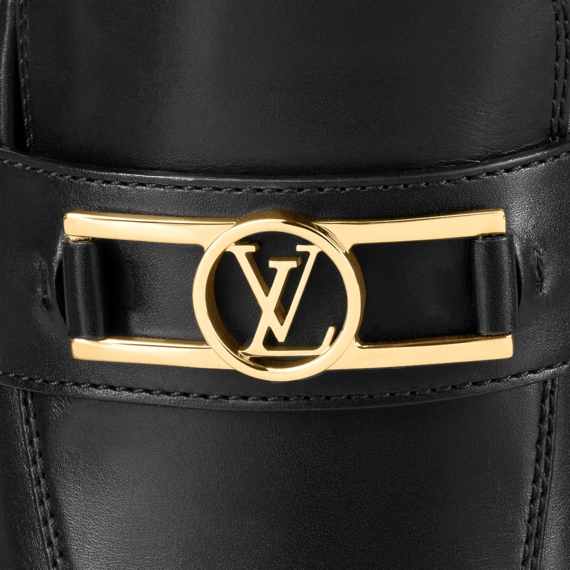 The Upper Case flat loafer is crafted from smooth black calf leather and embellished with a gold-tone LV accessory inspired by the clasp of the emblematic Dauphine bag. This sleek, refined style has a traditional sacchetto construction, with no insole, for exceptional suppleness and lightness. It is finished with a leather outsole. Read less